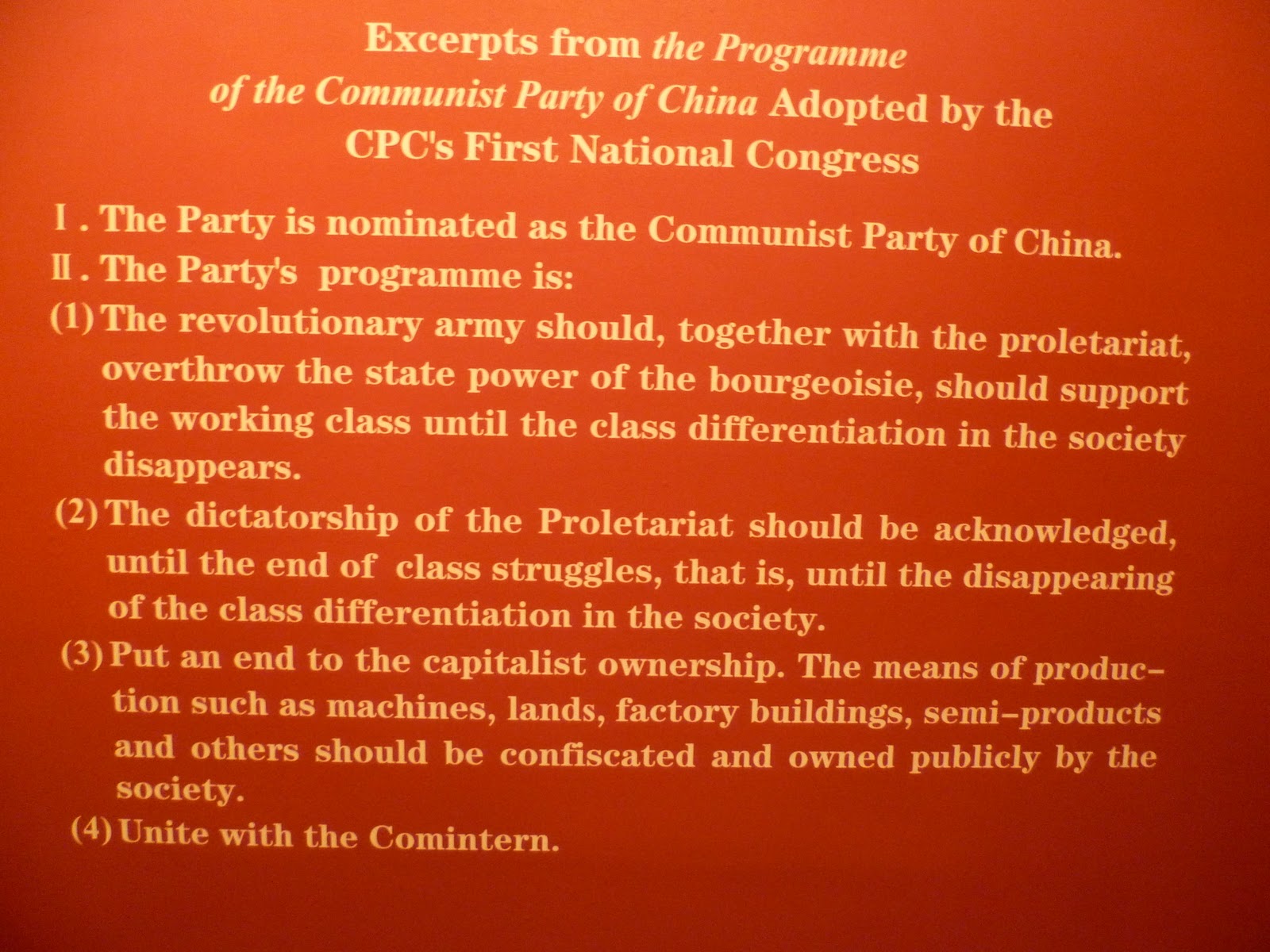It shows the original plan for the Communist Party....which is such a good plan. But we later saw that most of the delegates at this meeting were later expelled from the Party, sent to prison, or murdered. A flaw in the plan I think when the founders are killed by the followers.